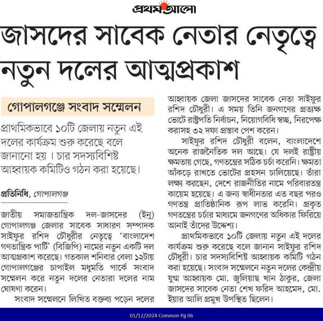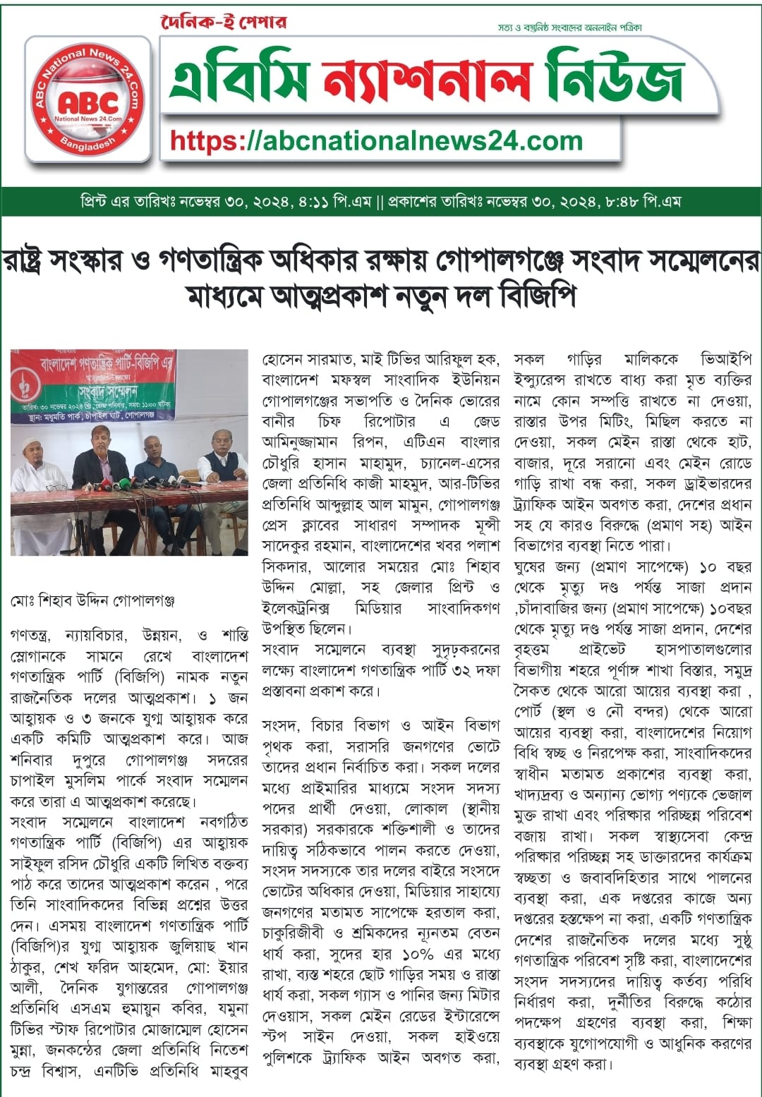 রাষ্ট্র সংস্কার ও গণতান্ত্রিক অধিকার রক্ষায় গোপালগঞ্জে সংবাদ সম্মেলনের মাধ্যমে আত্মপ্রকাশ করল নতুন দল বিজিডি